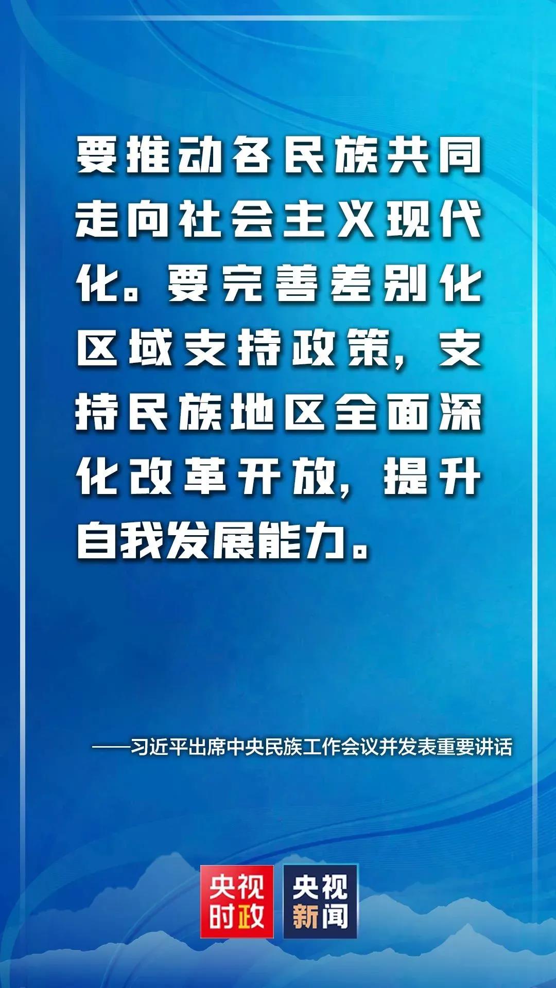习近平指出,要推动各民族共同走向社会主义现代化。要完善差别化区域支持政策,支持民族地区全面深化改革开放,提升自我发展能力。民族地区要立足资源禀赋、发展条件、比较优势等实际,找准把握新发展阶段、贯彻新发展理念、融入新发展格局、实现高质量发展、促进共同富裕的切入点和发力点。要加大对民族地区基础设施建设、产业结构调整支持力度,优化经济社会发展和生态文明建设整体布局,不断增强各族群众获得感、幸福感、安全感。要支持民族地区实现巩固脱贫攻坚成果同乡村振兴有效衔接,促进农牧业高质高效、乡村宜居宜业、农牧民富裕富足。要完善沿边开发开放政策体系,深入推进固边兴边富民行动。
